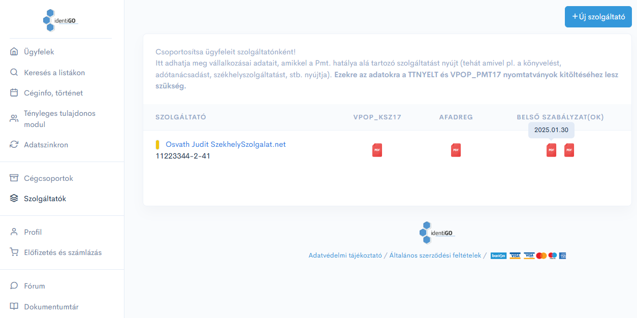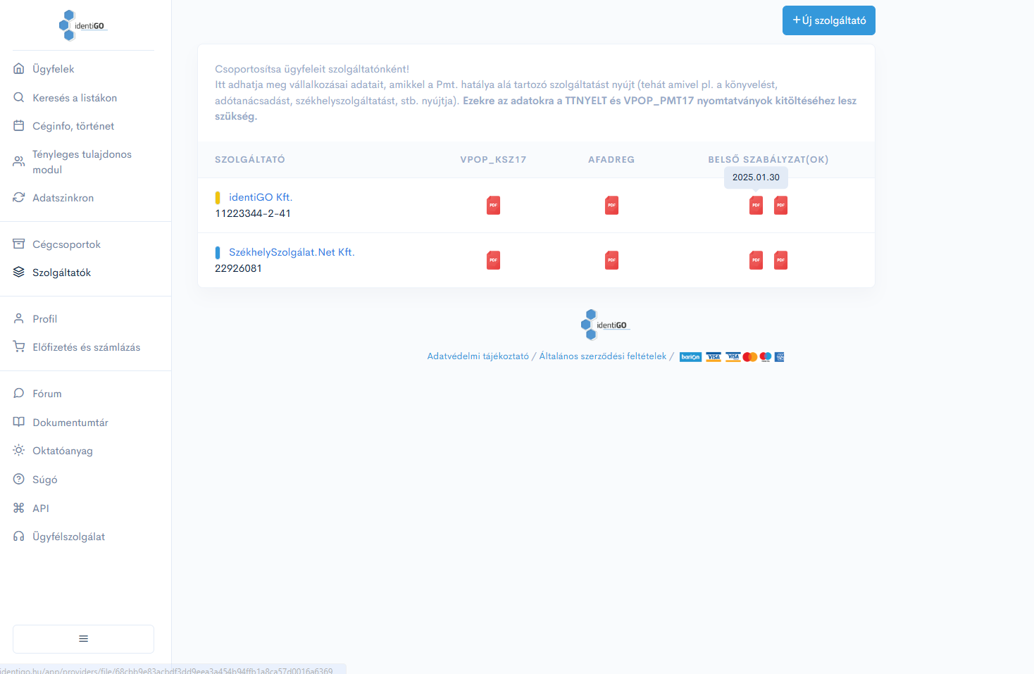 Az identiGO-ban lehetőség van a Belső szabályzatok, egyéb nyomtatványok (KSZ17, AFADREG) tárolására, ráadásul egy fiókon belül több szolgáltató is rögzíthető. Így ellenőrzéskor biztos lehet abban, hogy minden azonnal a rendelkezésére áll majd.