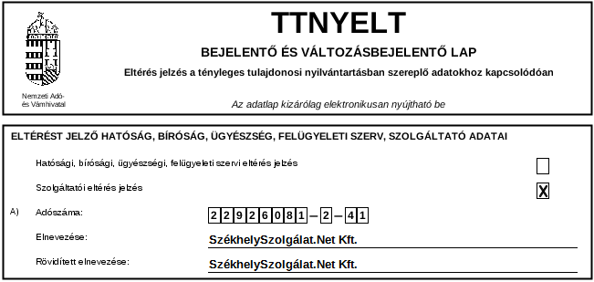 - az eltérés típusa: ÚJ tényleges tulajdonos megadása, vagy tényleges tulajdonos TÖRLÉSE, vagy tényleges tulajdonos adatainak MÓDOSÍTÁSA