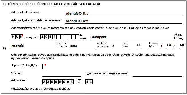Itt kell megadni a Szolgáltató adatait, aki az eltérésjelzést küldi: