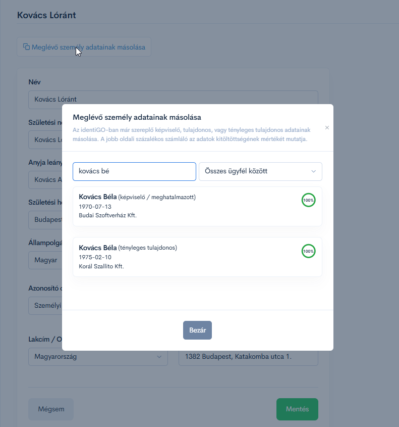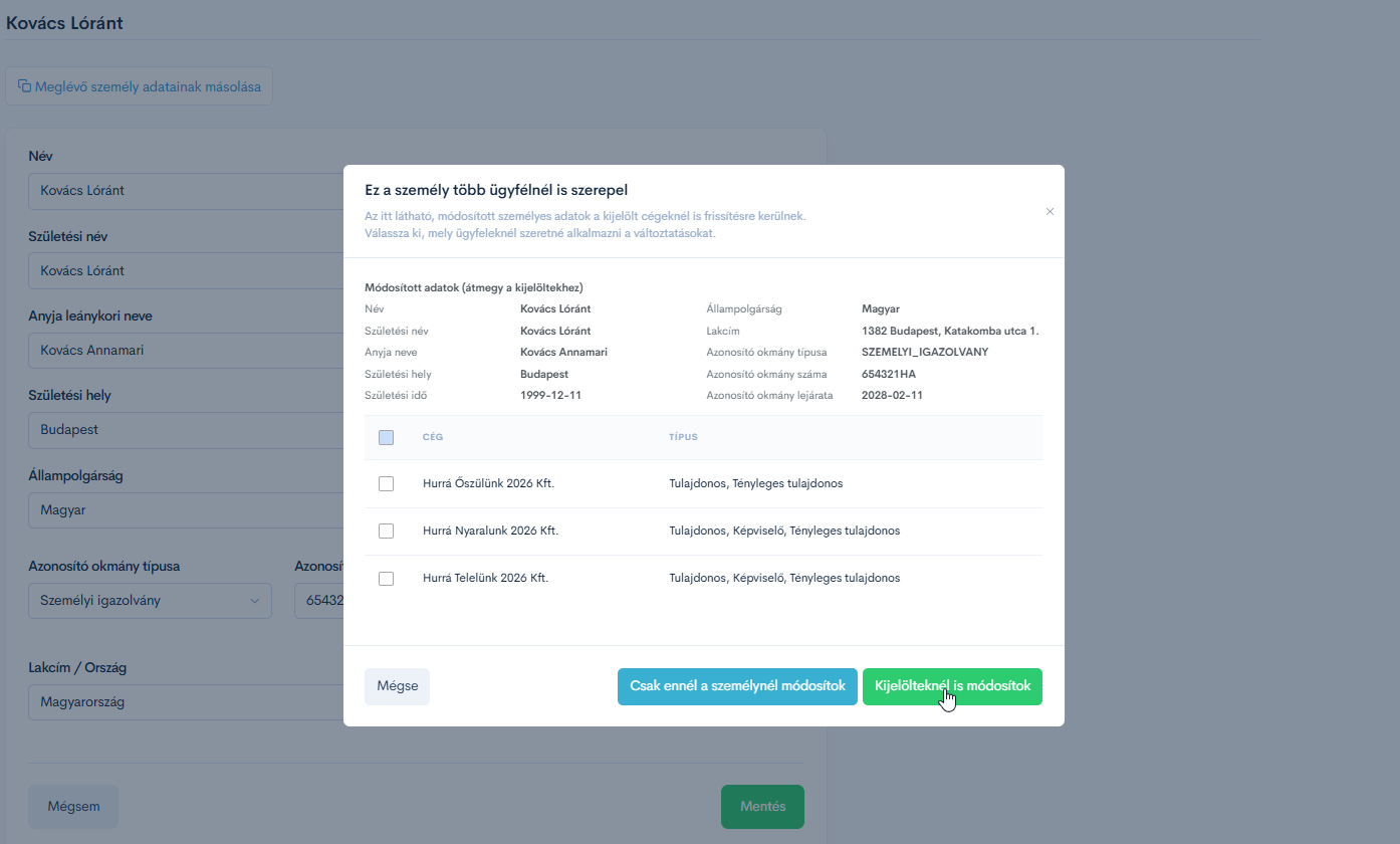 Gyakori élethelyzet, hogy ugyanaz a személy több ügyfélnél vagy több szerepkörben is megjelenik – ilyenkor különösen fontos, hogy a személy adatai egységesek és naprakészek legyenek a teljes nyilvántartásban.