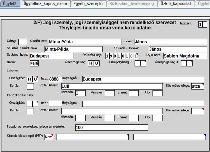ÜGYFÉL3 lap - 2/F Jogi személy, jogi személyiséggel nem rendelkező szervezet - Tényleges tulajdonosára vonatkozó adatok