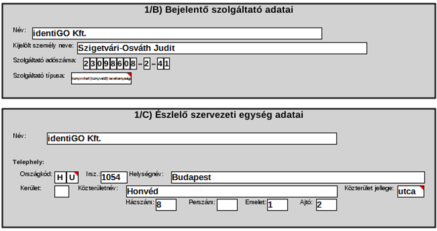 BEJELENTÉS lap - 1/B) Bejelentő szolgáltató adatai és 1/C) - Észlelő szervezeti egység adatai